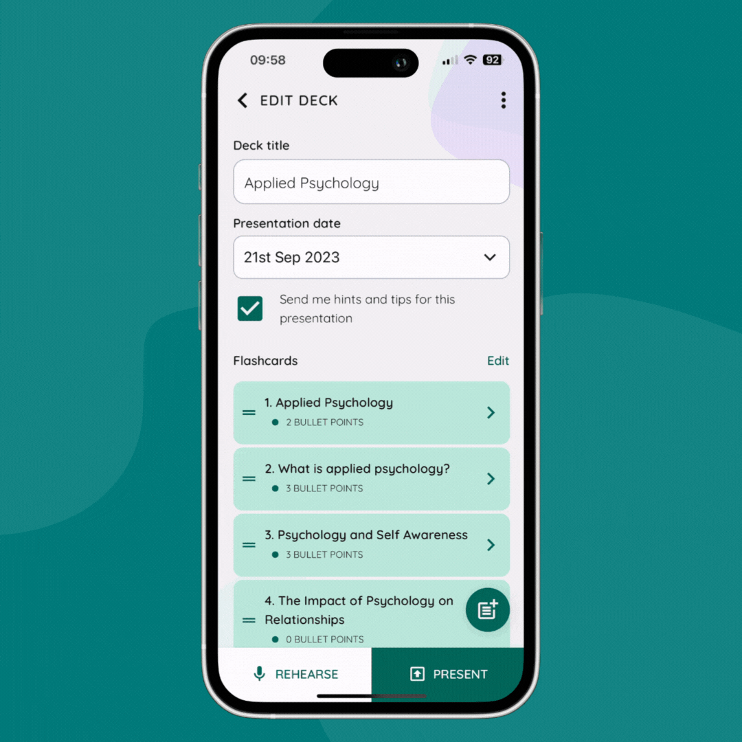 Karolina began using Present Pal’s flashcard and rehearsal features to break down what she wanted to say into manageable prompts and practice at her own pace. Being able to rehearse in a structured and accessible format helped her retain information, get into a routine earlier, and feel more in control by the time her presentation came around.